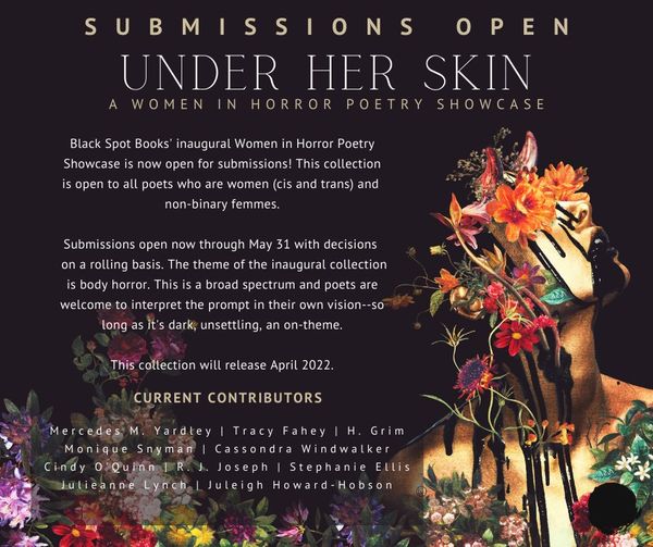 Under Her Skin On June 10, 2021 By Morgan SylviaIn horror, poetry, pretty things, publishing, Uncategorized, Women In Horror, writing So excited to be joining the TOC on this anthology! I actually have two pieces going in. Due in April 2022 from Black Spot Books. Share this: Click to share on Tumblr (Opens in new window) Tumblr Click to email a link to a friend (Opens in new window) Email Click to share on Pinterest (Opens in new window) Pinterest Click to share on Reddit (Opens in new window) Reddit Click to share on Facebook (Opens in new window) Facebook Click to share on X (Opens in new window) X Click to share on LinkedIn (Opens in new window) LinkedIn Click to print (Opens in new window) Print Like Loading... Related